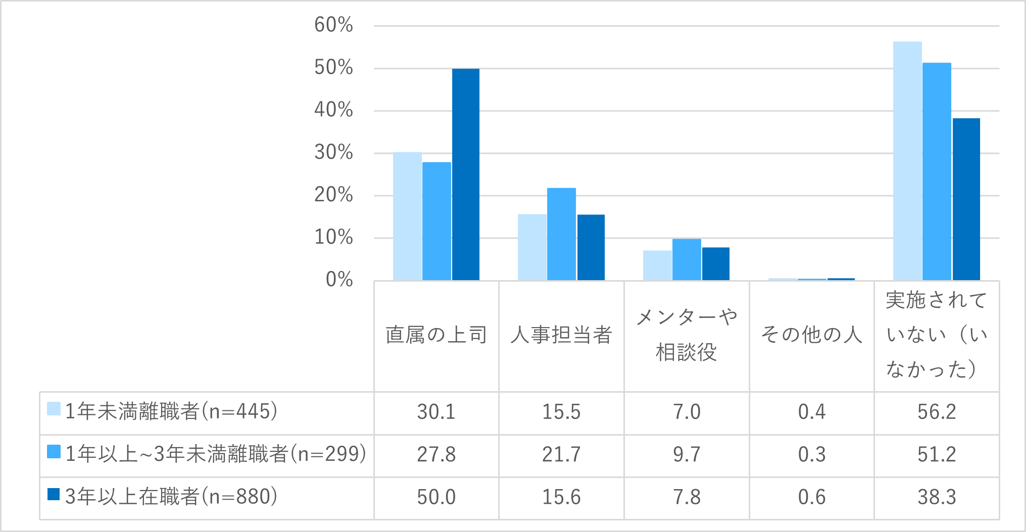 ■入社後面談が実施されていない割合は1年未満離職者で2%。3年以上在職者の38.3%に比べ、17.9ポイント高い。