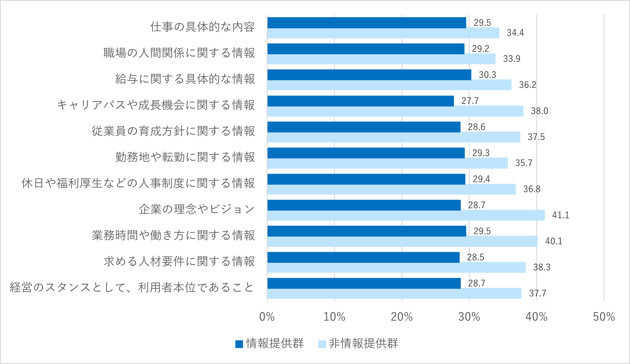 ■入社前に適切な情報提供を行っている事業者の方が、行っていない事業者と比べ1年未満離職率が全ての情報提供項目で低く、最も差が大きかった項目は「企業理念やビジョン」で5ポイント。